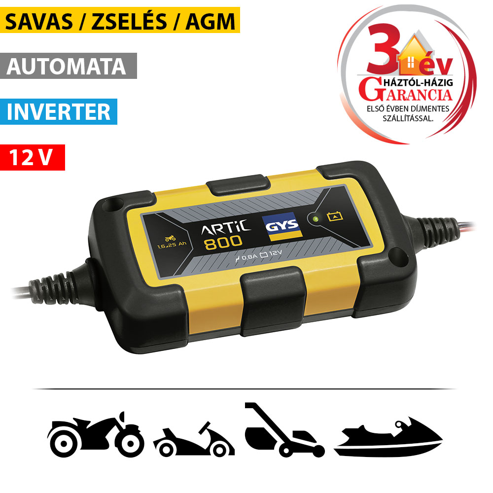 Kifejezetten motorok, jet-skik, kartingok vagy fűnyírók 12V-os akkumulátorának töltésére fejlesztették ki. Az ARTIC 800 (0.8 A) mikroprocesszorral ellenőrzött, automata töltést biztosít. Hatékony, kompakt és könnyű, 2-szer olyan gyors felügyelet nélküli töltést garantál, mint egy hagyományos akkumulátortöltő.